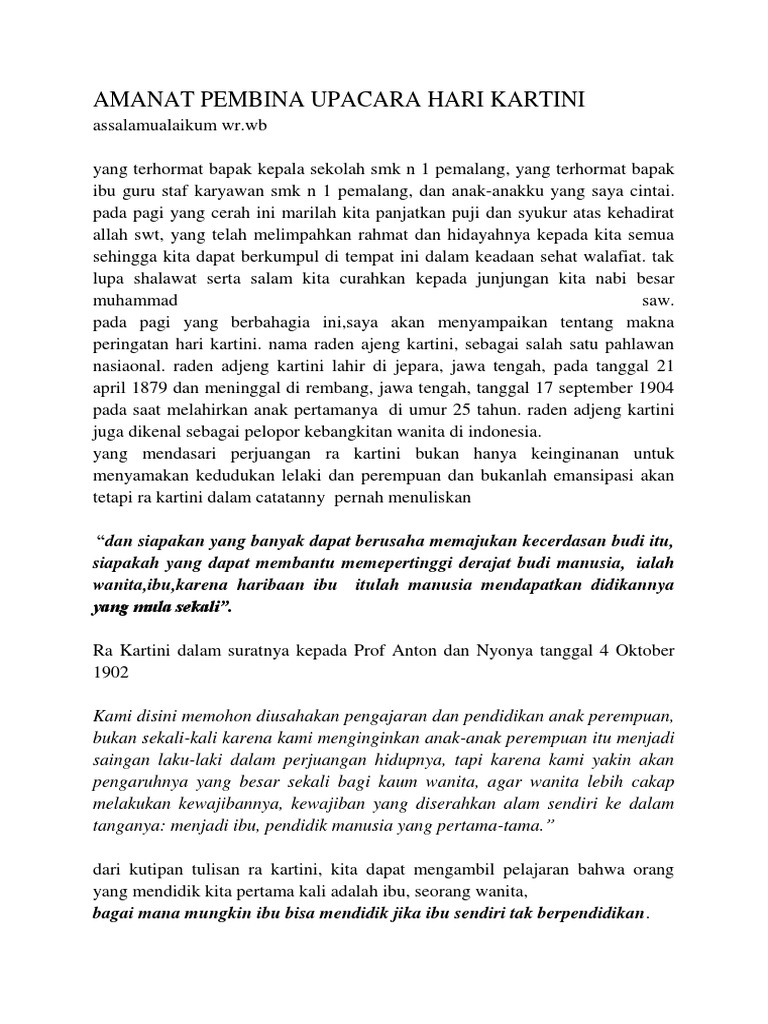 Berikut ini adalah 10 contoh amanat pembina upacara Hari Kartini 2026: