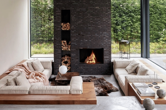 Menambahkan perapian menjadikan sunken living room lebih hangat, mewah, dan cozy. Perapian bisa menjadi focal point yang sempurna untuk berkumpul di musim dingin.