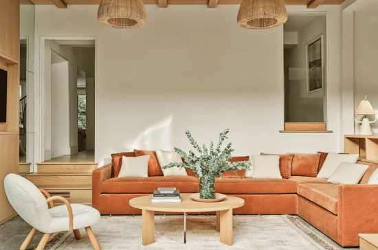 Gaya santai dengan kayu terang, upholstery hangat, dan bentuk furnitur organik. Memberikan nuansa retro namun tetap lembut dan natural.