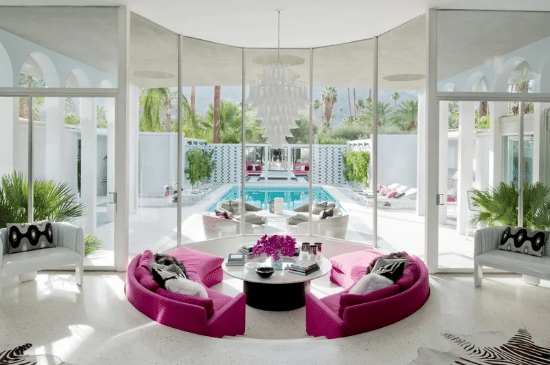 Terinspirasi dari desain Martyn Lawrence Bullard di Palm Springs, gunakan sofa berwarna cerah, material mewah seperti velvet atau ultrasuede, dan lantai terrazzo untuk nuansa glamor era 1960-an.