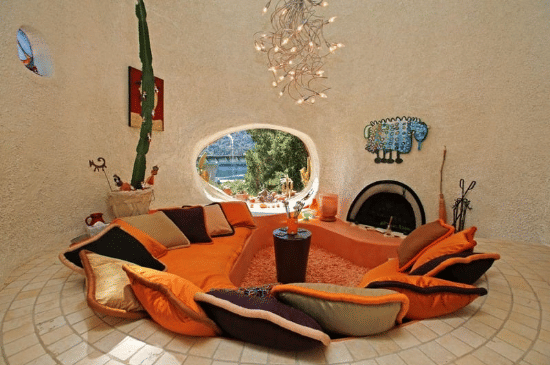 Terinspirasi dari rumah “Flintstone House”, gunakan karpet shag, tembok stucco, dan bentuk arsitektur unik untuk efek playful dan eksperimental. Pilih warna hangat seperti oranye, coklat, atau krem, gunakan perabot dengan bentuk futuristik atau tidak simetris. Memberikan karakter kuat yang ideal untuk rumah kreatif atau yang ingin area sunken menjadi conversation starter.
