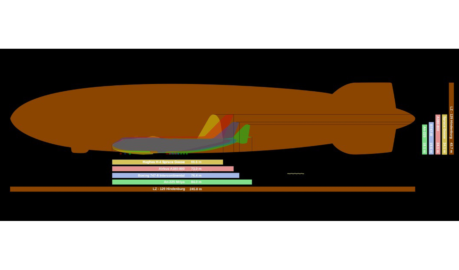 Kapal udara kelas Hindenburg adalah pesawat terbang terbesar yang pernah dibuat, dan skala mereka hampir tidak bisa dipahami oleh pikiran modern karena panjangnya hampir seperempat kilometer! Mereka memiliki ukuran 245,3 m (803 kaki 10 inci), yang tiga kali lebih panjang daripada Boeing 747, atau hampir dua belas pesawat pembom Lancaster!
