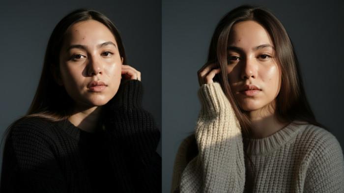 Fokus utama prompt ini adalah menciptakan potret mode artistik dengan pencahayaan samping yang dramatis, menonjolkan efek chiaroscuro pada wajah wanita muda. Ia mengenakan sweater tebal bertekstur, yang berpadu dengan latar belakang minimalis, suram, dan elegan, membangkitkan gaya fotografi editorial mode tinggi yang biasa ditemukan di majalah mewah. Konsepnya adalah perpaduan antara keindahan alami, tekstur pakaian, dan permainan cahaya yang kontras.