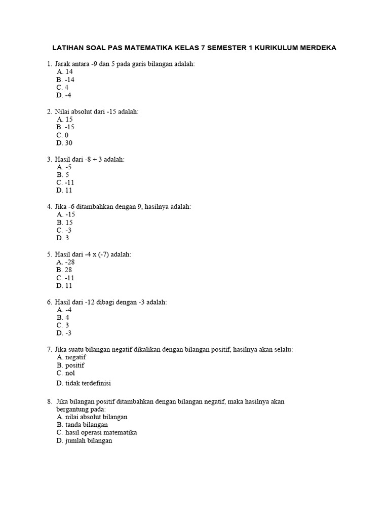 Untuk membantu siswa mempersiapkan diri, tersedia latihan soal PAS Matematika kelas 7 Semester 1 Kurikulum Merdeka. Latihan ini terdiri dari 40 contoh soal pilihan ganda, lengkap dengan kunci jawaban. Berikut adalah beberapa contoh soal dan jawabannya: