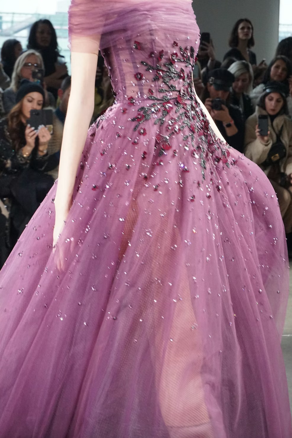 Gaun tanpa tali bahu yang dihiasi mutiara