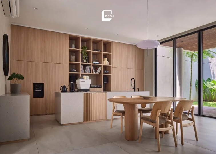 Desain meja makan ini multifungsi sebagai kitchen island. Selain untuk makan, meja ini juga bisa digunakan sebagai area persiapan masak. Material solid berwarna netral memberikan kesan modern dan bersih. Pencahayaan linear dan tanaman gantung menambah kesan segar dan hidup.