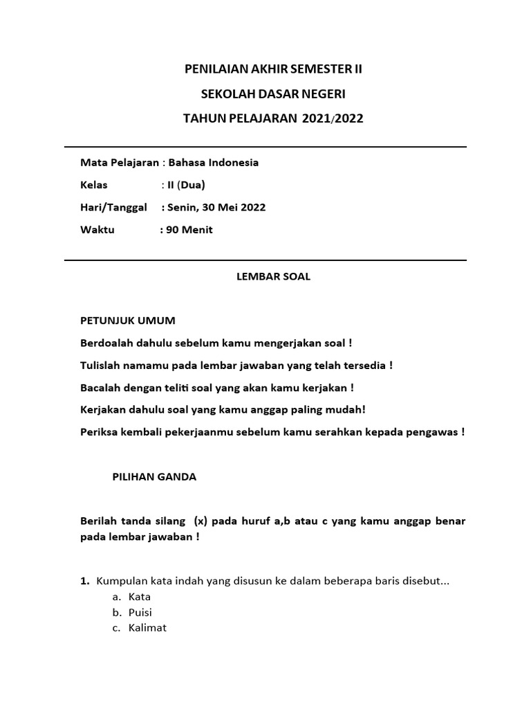 Soal dan Kunci Jawaban Pilihan Ganda Bahasa Indonesia Kelas 2