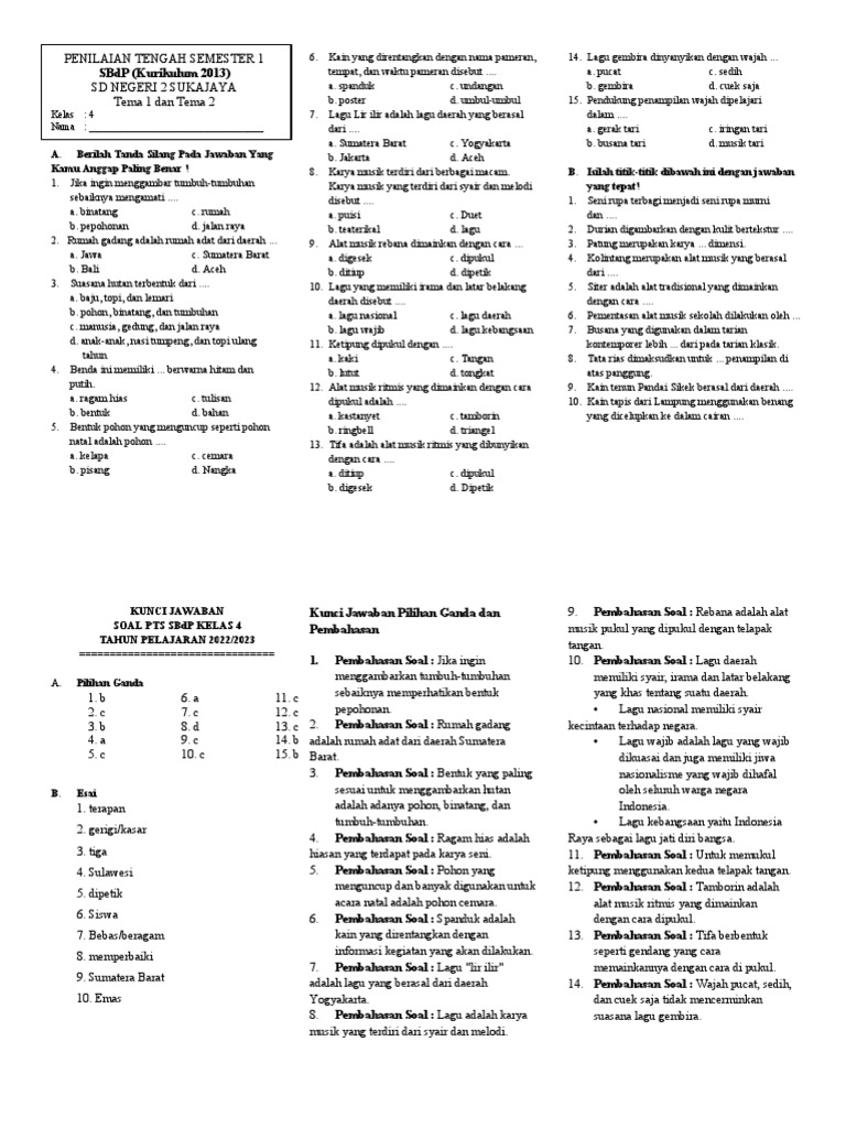 Soal dan Jawaban Seni Budaya Kelas 4 SD