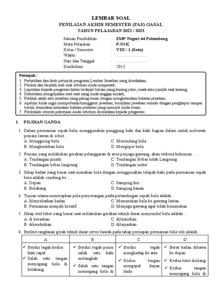 Berikut ini adalah kumpulan soal ujian PJOK (Pendidikan Jasmani, Olahraga, dan Kesehatan) untuk siswa kelas 8 SMP/MTs. Soal-soal ini dirangkum sebagai bahan belajar yang dapat digunakan untuk memperdalam pemahaman dan meningkatkan kemampuan dalam berbagai aspek olahraga.