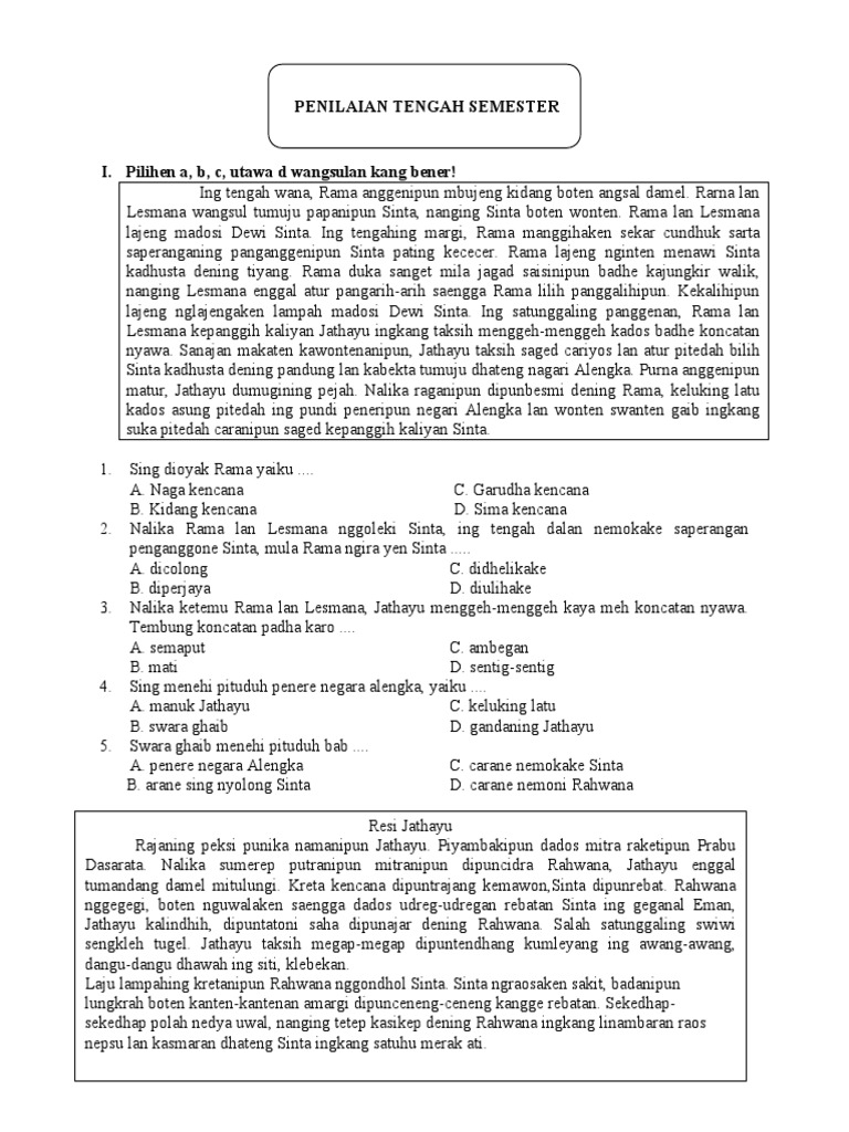 Soal-soal PTS (Penilaian Tengah Semester) Bahasa Jawa kelas 8 SMP semester 1 tahun 2025 telah disusun berdasarkan Kurikulum Merdeka untuk tahun pelajaran 2025/2026. Soal ini dilengkapi dengan kunci jawaban yang dapat digunakan sebagai bahan belajar di rumah maupun untuk menguji pemahaman siswa. Berikut adalah contoh soal dan jawabannya: