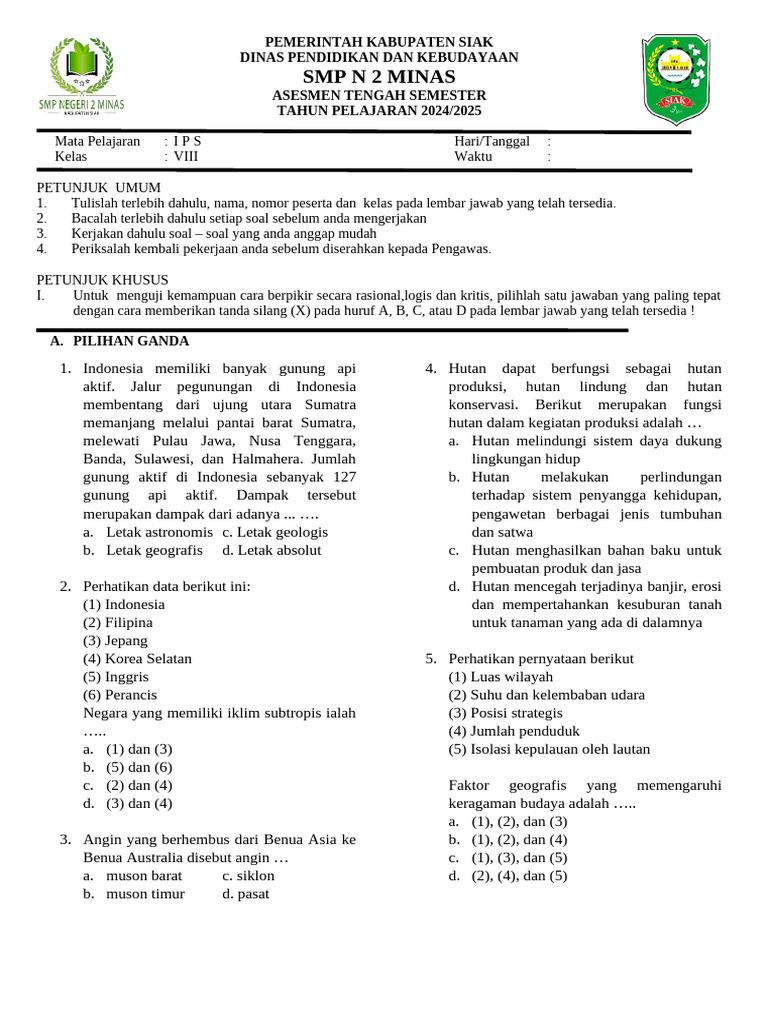 Berikut ini adalah kumpulan soal latihan PTS (Penilaian Tengah Semester) untuk mata pelajaran Ilmu Pengetahuan Sosial (IPS) Kelas 8 SMP Semester 1 tahun 2025. Soal-soal ini disusun berdasarkan Kurikulum Merdeka dan dapat digunakan sebagai bahan belajar siswa maupun uji pemahaman.