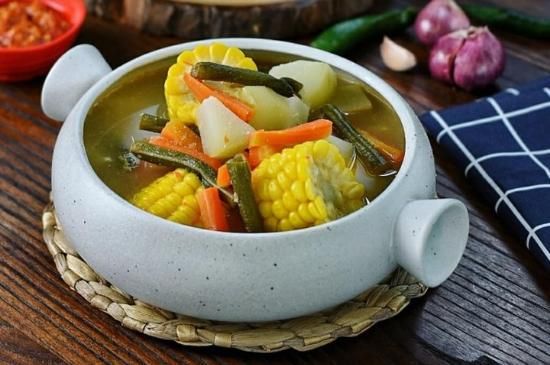 - Setelah bumbu matang, masukkan ke dalam air yang sedang mendidih. Tambahkan jagung, melinjo, dan labu siam (jika digunakan). Masak hingga sayuran lunak.