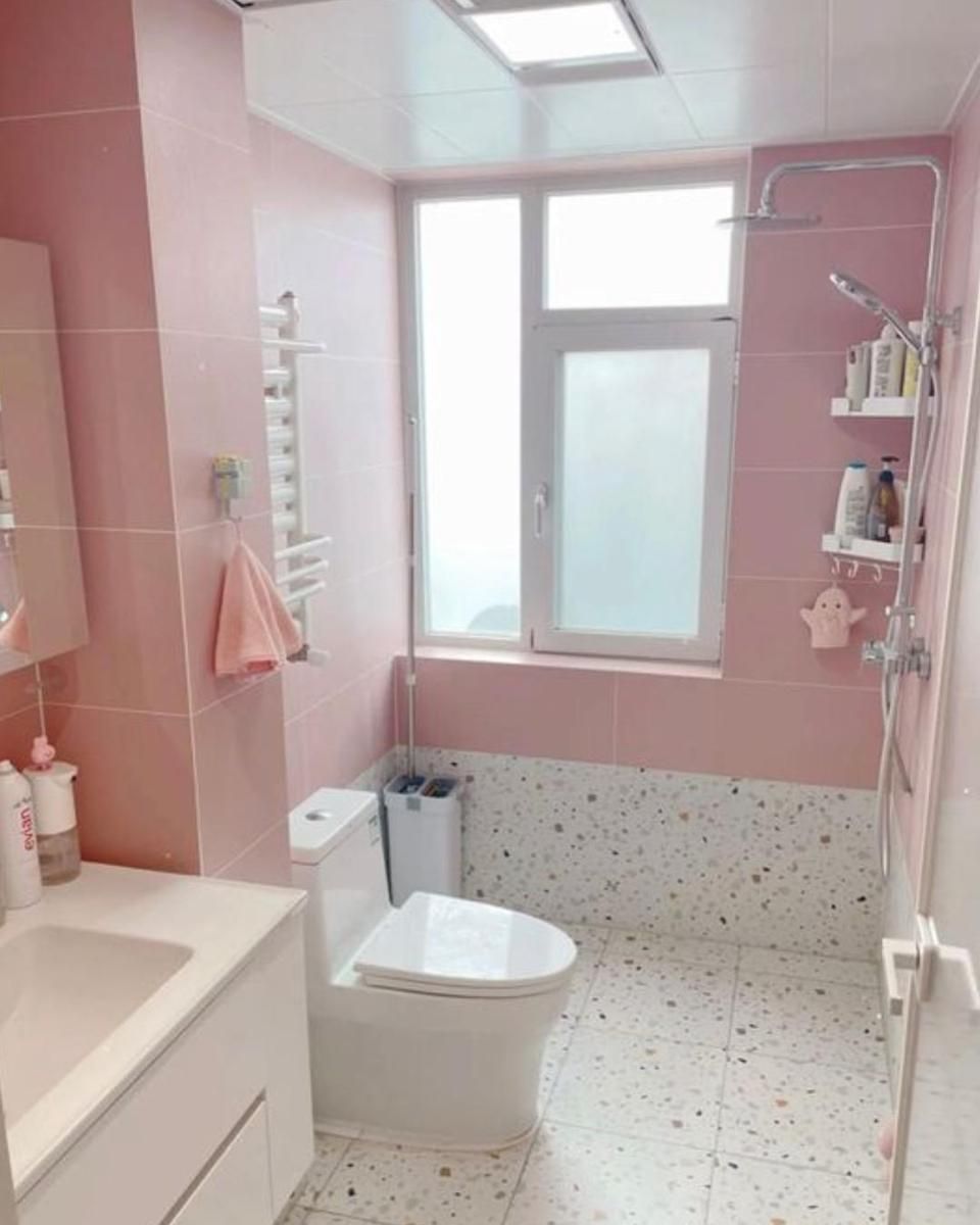 7. Desain Kamar Mandi Warna Pink dengan Jendela Ala Korea
