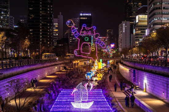 Sungai yang mengalir di jantung kota Seoul ini menjadi lokasi yang menawan saat salju turun. Berawal dari Cheonggye Plaza (dekat Stasiun City Hall), area ini sering mengadakan Festival Lampu (Lantern Festival) di musim dingin. Lokasi ini gratis dan dapat diakses 24 jam di sepanjang jalur pejalan kakinya.