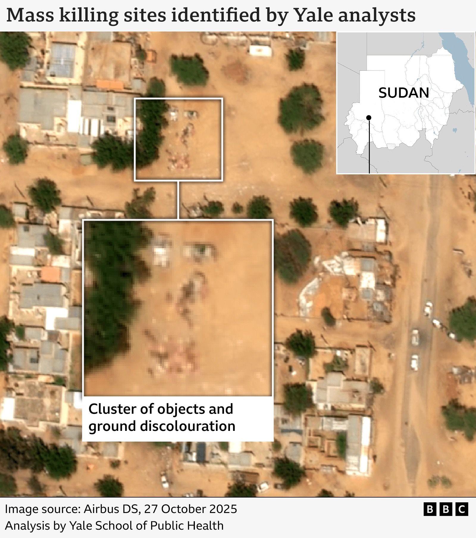 Citra satelit yang diambil pada 26 Oktober mengonfirmasi bahwa eksekusi juga dilakukan di jalan-jalan Kota el-Fasher, demikian laporan terbaru yang diterbitkan Yale Humanitarian Research Lab. Para analis lembaga itu menyoroti “kelompok-kelompok besar” yang terlihat dalam citra itu. Gambar-gambar tersebut, menurut mereka, “sesuai dengan ukuran tubuh manusia dewasa dan tidak muncul dalam citra sebelumnya”. Laporan itu juga menunjukkan adanya “perubahan warna” yang mungkin merupakan bekas darah manusia.