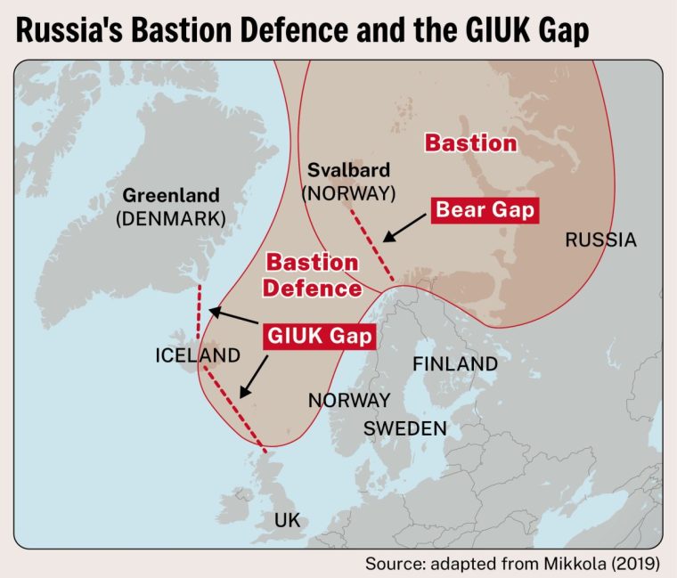 Dalam hal terjadi perang,Kapal selam Rusiadari pangkalan Angkatan Laut Utaranya dekat Murmansk akan berusaha untuk mendominasi lautan di sekitar Britania Raya, khususnya titik pemeriksaan strategis Greenland-Iceland-UK (GIUK) – memutus jalur pasokan transatlantik dengan cara yang sama seperti kapal selam Jerman mencoba selama Perang Dunia I dan II.