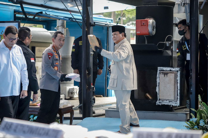Prabowo langsung menuju tempat barang bukti yang akan dimusnahkan. Terlihat ia dan Listyo sempat berbincang saat melihat barang bukti tersebut.