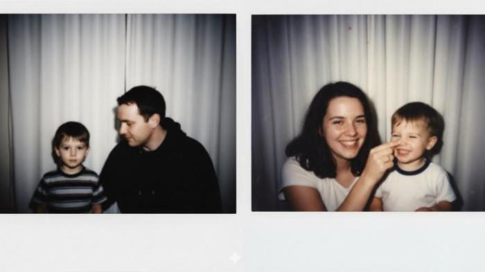 Gabungkan foto masa kecil dan dewasa. Tampilkan mereka sedang merangkul (atau berhadapan). Tampilkan keduanya sedang berhadapan dengan senyum tipis, seolah-olah saling menatap dengan penuh makna. Hasilkan dalam gaya foto polaroid yang pudar dengan sedikit efek grain dan pencahayaan sepia yang hangat. Berikan nuansa nostalgia yang kuat, dengan focus pada ekspresi wajah yang mendalam.