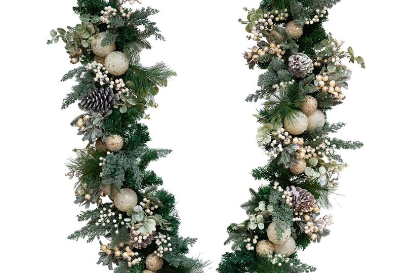 Garis hiasan Kilkenny Design, hiasan berbentuk bola putih buram dengan pohon pinus dan buah beri, seharga €110, kini menjadi €55. Tersedia di toko-toko seluruh negeri dankilkennydesign.com