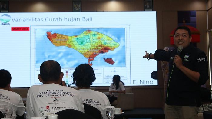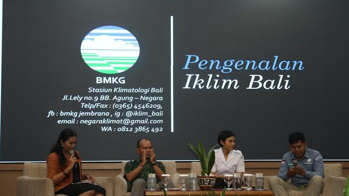 Dwi Wiratmaja menjelaskan pengenalan iklim di Bali. Diuraikan, total ada 118 titik pengamatan hujan di seluruh Bali. Ada yang mengirimkan data hujan tiap 10 hari, lantas dikirimkan data sampai pelosok Nusa Penida, Klungkung.