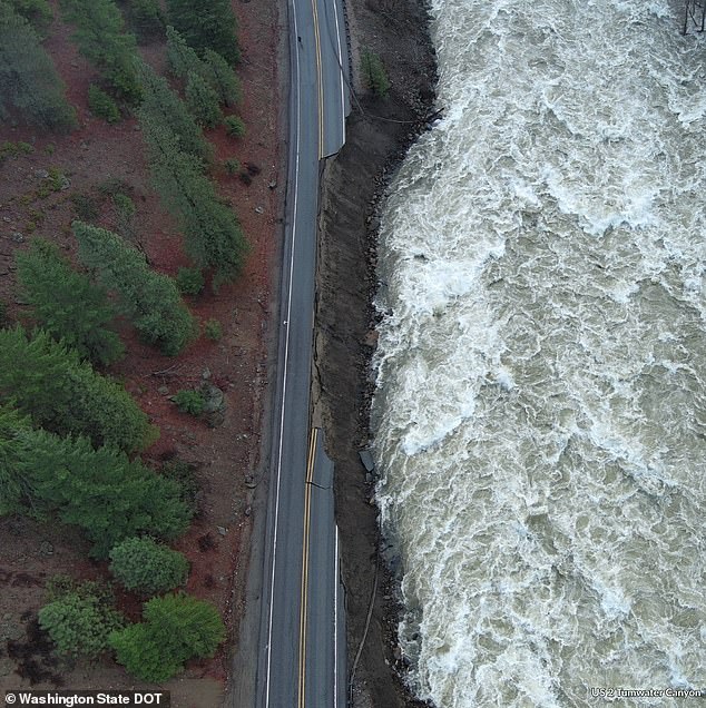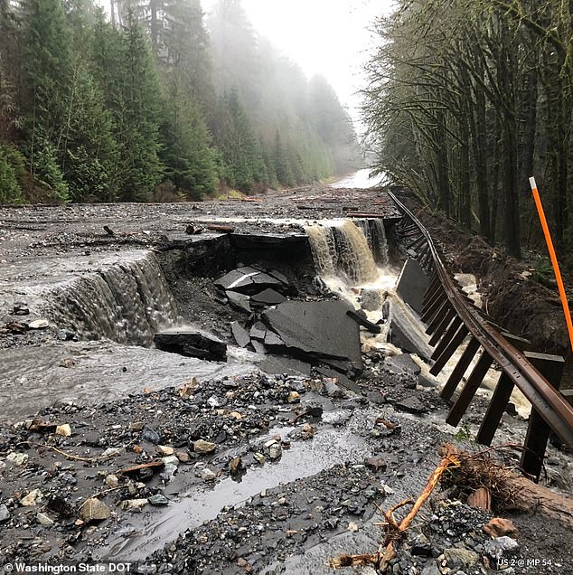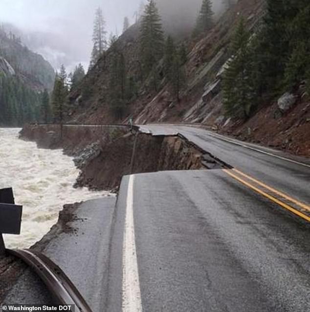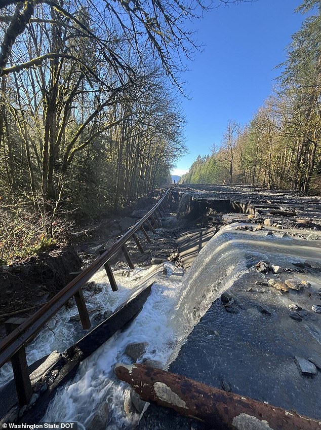 Foto yang dirilis oleh Departemen Perhubungan Washington (WSDOT) menunjukkan satu bagian jalan raya utama dengan seluruh lajur retak dan jatuh ke aliran air deras di bawahnya dekat Terowongan Tumwater.