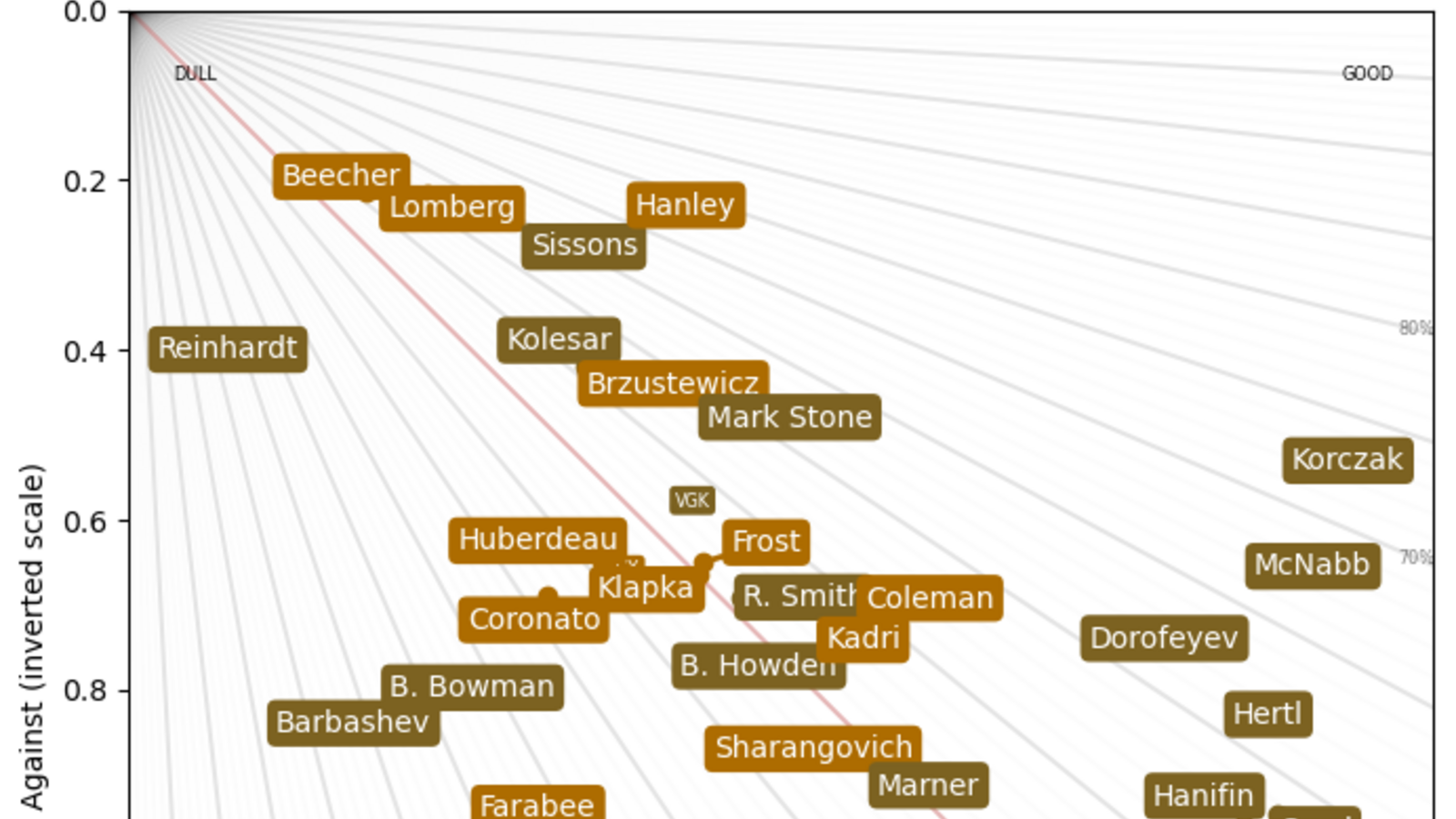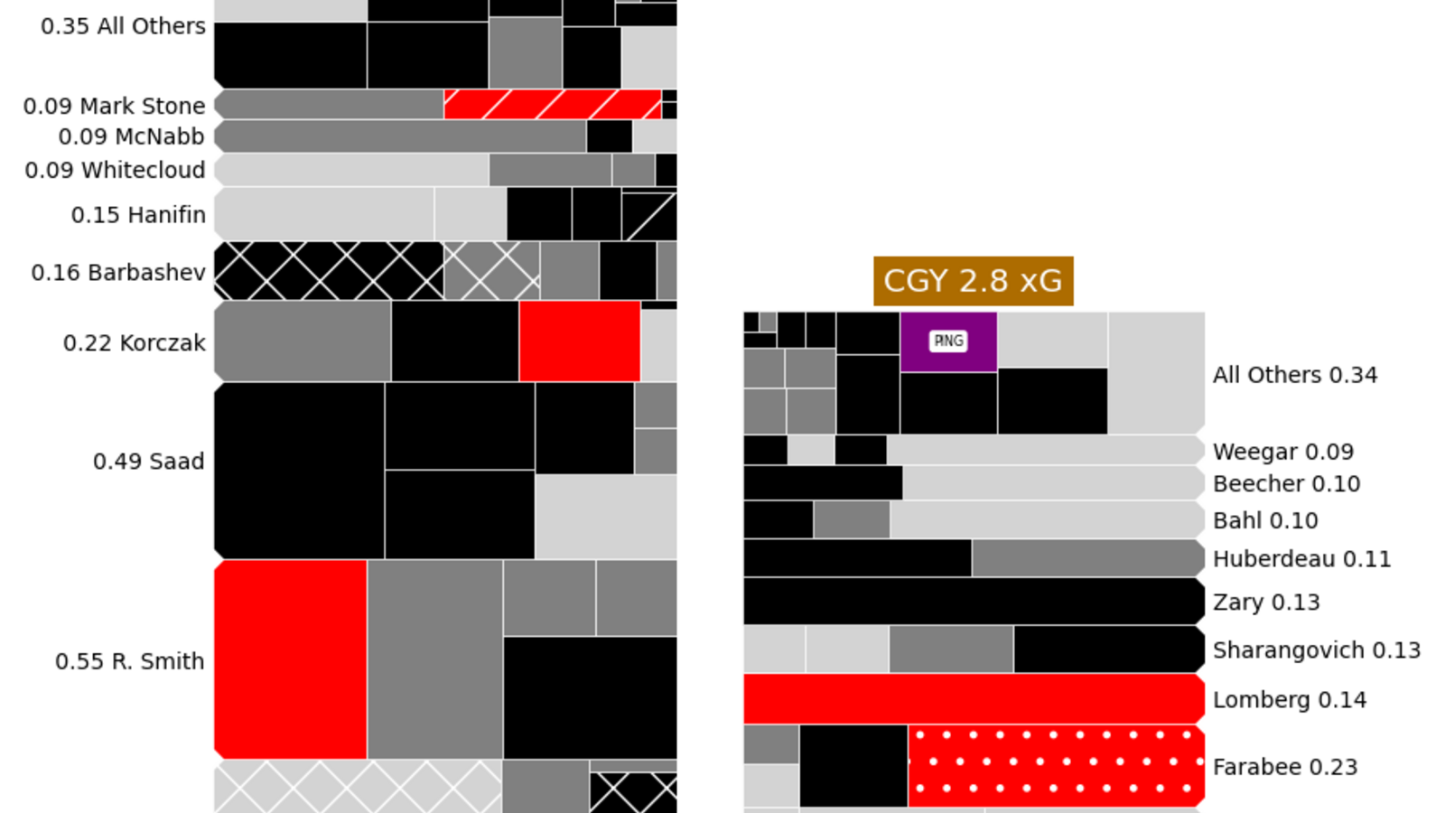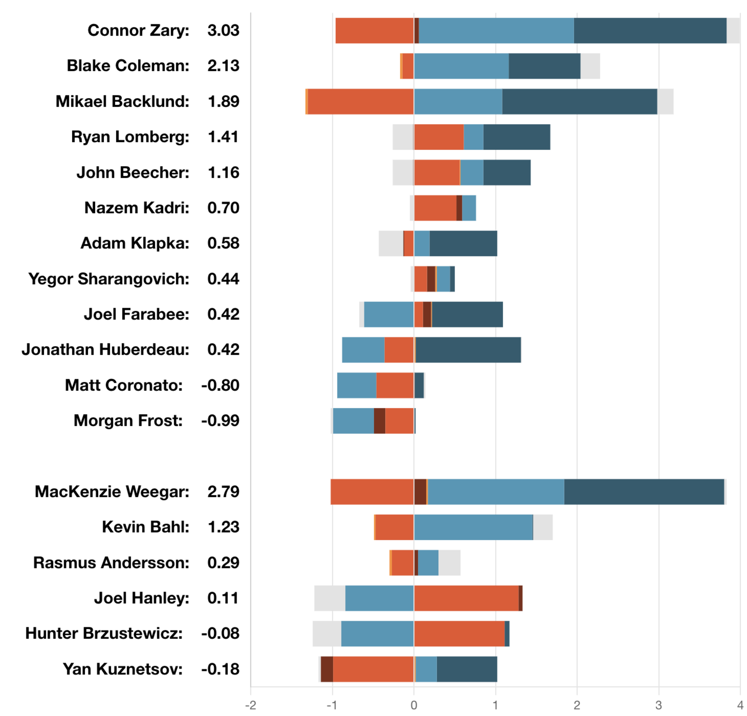 Kursi Raja –Rencana dengan Joel Hanley (73,10% CF%) dan Hunter Brzustewicz (68,02%) berjalan sangat baik. Mulai dari zona ofensif atau netral, pertahankan bek muda itu di lini serang sebanyak mungkin, biarkan Hanley ada di sana untuk mengatasi ketidakmampuan bertahan. Ini telah menjadi resep kesuksesan sejak awal dan melawan Vegas semuanya kembali berjalan dengan baik. Tidak ada gol yang kebobolan, keunggulan signifikan dalam jumlah tembakan, serta kepercayaan lebih besar terhadap pemain yang dipanggil. Flames tidak perlu merasa bersalah atas penghapusan bakat dari Wranglers – itulah tujuan AHL, yaitu mengembangkan pemain – tetapi saya pikir setelah melihat kemampuan Brzustewicz dan Yan Kuznetsov (37,63%) untuk menjaga performa, membuat manajemen lebih mudah melepaskan pemain veteran lainnya dalam waktu dekat. Setidaknya saat ini Flames tahu bahwa mereka memiliki beberapa bek muda yang bisa beradaptasi, bukan tenggelam, selama bermain di NHL.