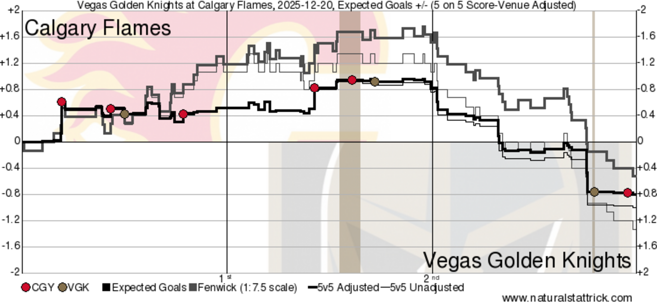Ini adalah Permainan Tim –Calgary langsung mengambil inisiatif. Connor Zary terbang, dan Flames melancarkan serangan ke area pemenjara sejak awal, menghasilkan beberapa gol cepat dan memperoleh keunggulan 2-0. Vegas membalas dengan satu gol mereka sendiri, tetapi alih-alih goyah, Flames terus bermain sesuai rencana mereka dan mendapatkan umpan pantul dari belakang Klapka untuk kembali unggul dua gol. Selama 40 menit, Flames unggul di mana-mana di lapangan – peluang berbahaya, kualitas, dan waktu dominasi. Ketika periode ketiga dimulai, Vegas menjadi lebih agresif dalam serangan mereka. Devin Cooley harus tetap waspada hingga peluit akhir, dan dia benar-benar memberikan yang terbaik. Vegas mendorong – sembilan peluang berbahaya di periode ketiga – tetapi hanya bisa mencetak satu gol tambahan, meninggalkan kesempatan bagi Huberdeau untuk mengunci pertandingan dengan gol kosong. Performa berkualitas dari Flames dari atas ke bawah dan hasil pertandingan yang membuat Saddledome bergemuruh.