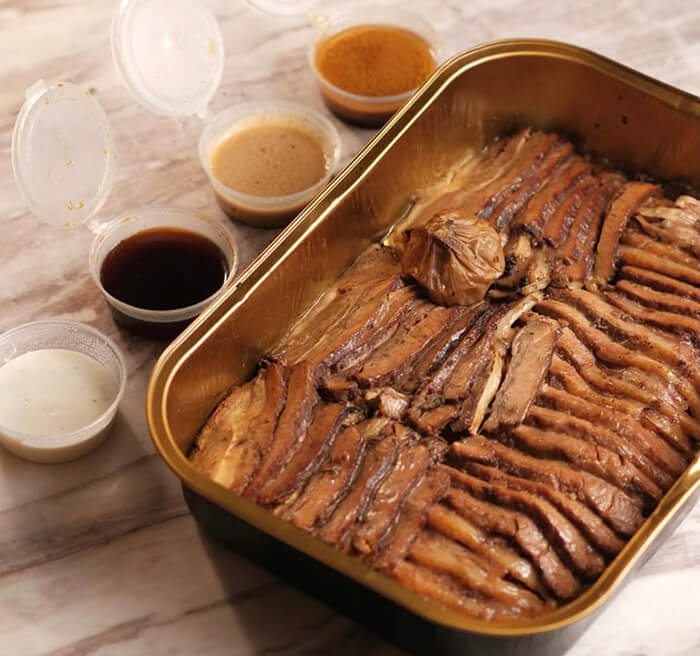 Mereka tidak bercanda—daging sapi panggang itu benar-benar meleleh di mulut Anda. Sangat empuk dan sangat lezat. Ini juga disajikan dengan konfit bawang putih dan berbagai saus: au jus, saus daging, demi glace truffle, dan aioli bawang putih. Nikmati dengan kentang tumbuk dan/atau nasi, dan saya bahkan suka menggunakannya dalam pandesal. Tersedia dalam empat ukuran—Berbagi, Keluarga, Pesta, atau Pesta Besar.