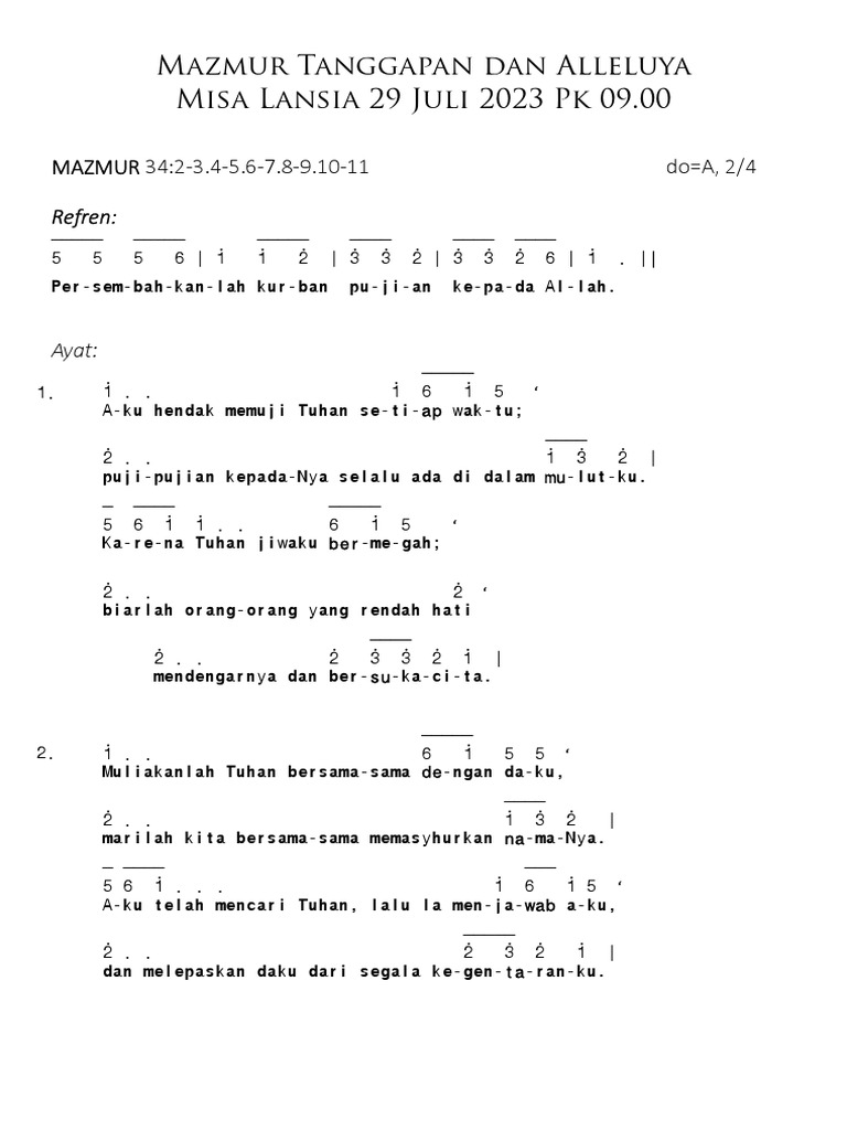 “Terpujilah Engkau, Tuhan, Allah nenek moyang kami, yang patut dihormati dan ditinggikan selama-lamanya. Terpujilah namaMu yang mulia dan kudus, yang patut dihormati dan ditinggikan selama-lamanya. Terpujilah Engkau dalam BaitMu yang mulia dan kudus, Engkau patut dinyanyikan dan dimuliakan selama-lamanya. Terpujilah Engkau di atas takhta kerajaanMu, Engkau patut dinyanyikan dan ditinggikan selama-lamanya. Terpujilah Engkau yang mendugai samudera raya dan bersemayam di atas kerub-kerub, Engkau patut dihormat dan ditinggikan selama-lamanya. Terpujilah Engkau di bentangan langit, Engkau patut dinyanyikan dan dimuliakan selama-lamanya.”