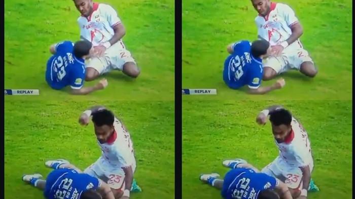 Keduanya pun terjatuh. Yance bangun (terlihat berlutut) lebih dulu saat badan Marc Klok masih di rumput.
