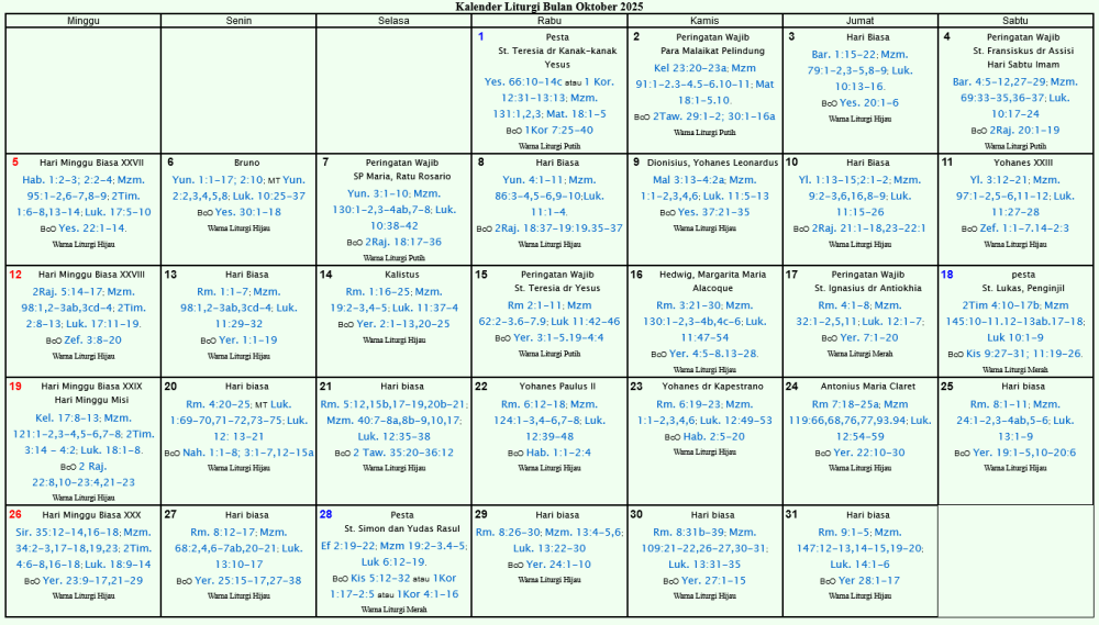 Pada hari Sabtu, 25 Oktober 2025, umat Katolik akan merayakan Hari Biasa Pekan XXIX. Dalam kalender liturgi, hari ini memiliki warna liturgi hijau yang menggambarkan harapan dan kehidupan baru dalam Kristus. Berikut adalah bacaan-bacaan yang dibacakan pada hari tersebut: