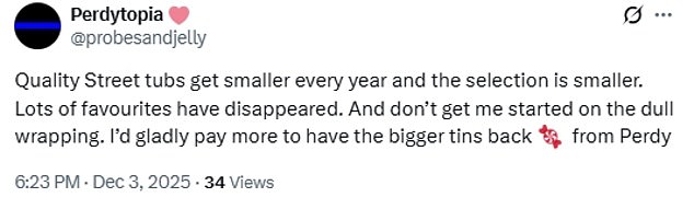 Seorang lagi berkata: “Tub Quality Street semakin kecil setiap tahunnya dan pilihannya semakin sedikit. Banyak favorit telah menghilang. Dan jangan tanya saya tentang kemasan yang membosankan.”