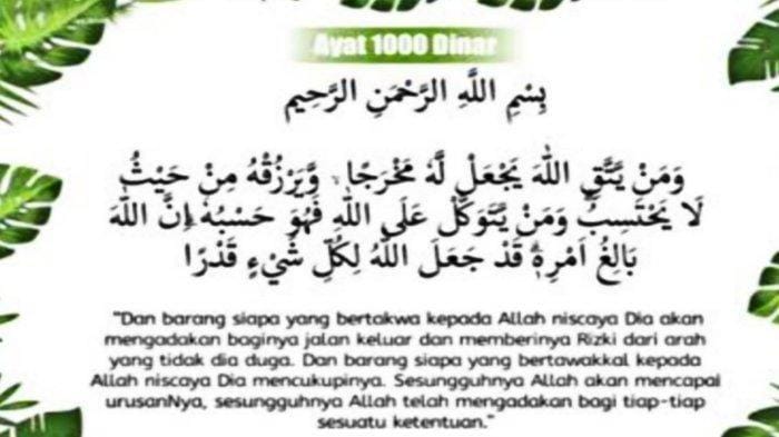 Ayat seribu dinar adalah bagian dari Surat At-Talaq yang memiliki keistimewaan khusus dalam membuka pintu rezeki. Ayat ini terdiri dari akhir ayat 2 dan seluruh ayat 3 dalam surat tersebut. Banyak orang percaya bahwa membaca ayat ini dengan penuh keyakinan dapat memudahkan proses mendapatkan rezeki, baik secara material maupun spiritual.