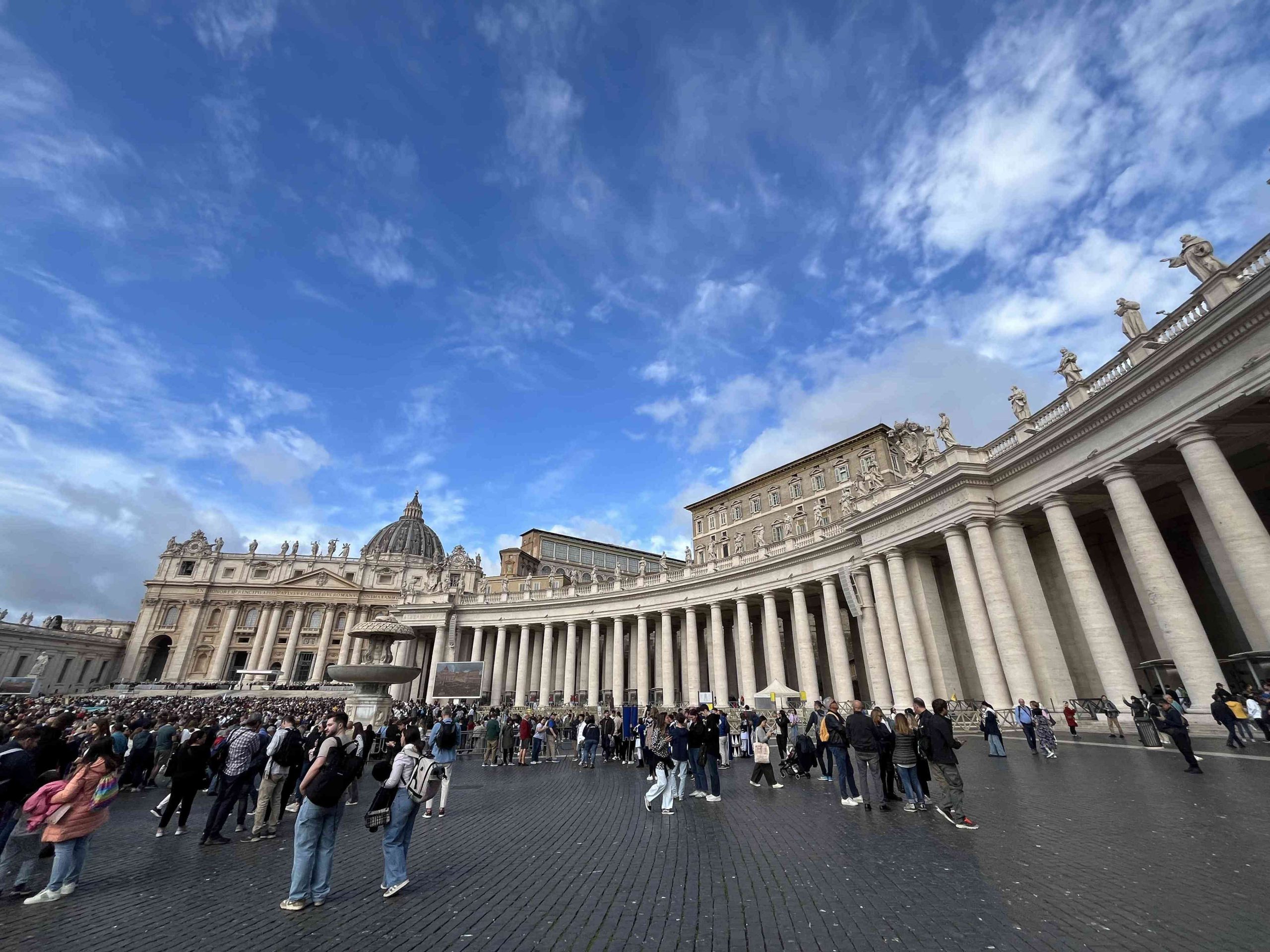 Ketika kami mendekati Basilica, antreannya sudah cukup panjang, padahal belum jam 10 pagi. Cuaca pagi itu masih sejuk, jadi tak apalah kalau harus mengantre. Beruntung antrean mengalir dengan cepat. Setelah melalui pemeriksaan yang cukup ketat oleh petugas, kami pun tiba di lapangan St Peter (Piazza San Pietro). Wah bahagia sekali rasanya akhirnya bisa menginjakkan kaki di tempat ini dan mimpi saya menjadi kenyataan. Selama ini saya hanya bisa melihat tempat ini dari foto-foto atau dari video, dan sekarang … saya berada di tempat ini. 👏