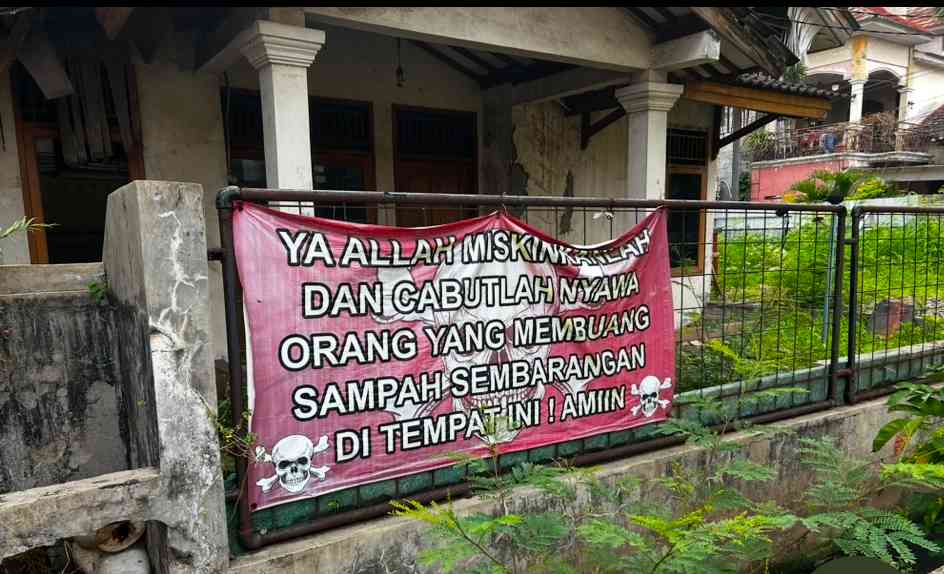 Tapi di bawah tulisan itu, tumpukan plastik sudah menumpuk. CCTV-nya entah berfungsi atau tidak. Di sinilah bedanya: spanduk dengan ancaman hukum kalah pamor dari spanduk dengan ancaman azab.