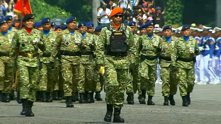 Di dalam barisan terlihat para jenderal mulai dari bintang satu hingga bintang tiga dari ketiga matra TNI berjalan di area defile. Mereka memberi hormat kepada Presiden Prabowo saat melintas di depan panggung kehormatan.