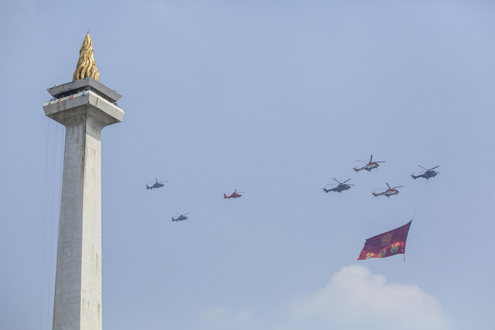 Pesawat jet tempur F-16 dan Sukhoi SU-30 melibas langit Jakarta pada Minggu (5/10). Atraksi ini merupakan bagian dari perayaan HUT ke-80 TNI yang digelar di Monas. Aksi dimulai dengan F-16 melakukan manuver High G-turn, pilot berbelok tajam sambil mengeluarkan asap merah dan putih.