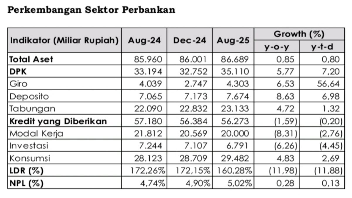 Aset perbankan di wilayah pegawasan Kantor OJK Tasikmalaya (KOTM) pada bulan Agustus 2025 meningkat sebesar 0,85 persen (yoy). Pertumbuhan Dana Pihak Ketiga (DPK) juga mencatat angka positif sebesar 5,77 persen (yoy), dengan deposito menjadi kontributor terbesar sebesar 8,63 persen (yoy). Giro dan tabungan masing-masing tumbuh sebesar 6,53 persen (yoy) dan 4,72 persen (yoy).