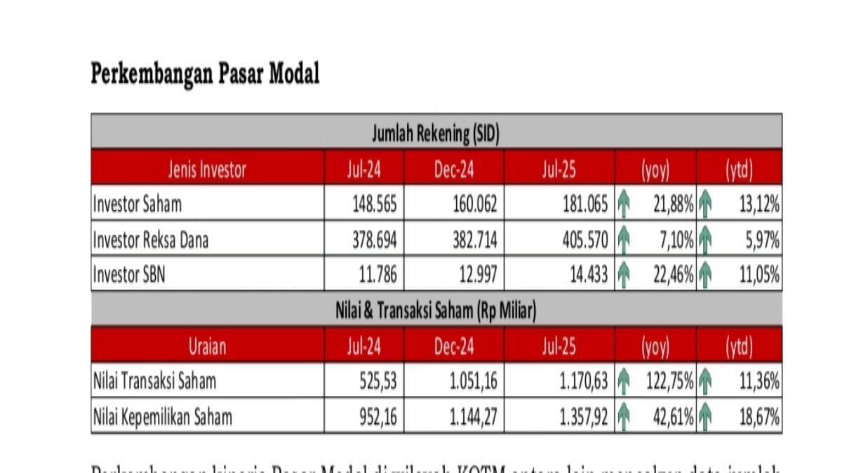 Perkembangan kinerja Pasar Modal di wilayah KOTM mencakup data jumlah Investor (SID), kepemilikan dan transaksi saham yang secara umum mengalami peningkatan. Peningkatan presentase jumlah investor (SID) yang paling tinggi adalah investor SBN sebanyak 2.647 investor atau 22,46 persen (yoy) menjadi 14.433 investor. Disusul oleh investor saham sebanyak 32.500 investor atau 21,88 persen (yoy) menjadi 181.065 investor, serta investor reksadana sebanyak 26.876 investor atau 7,10 persen (yoy) menjadi 405.570 investor.