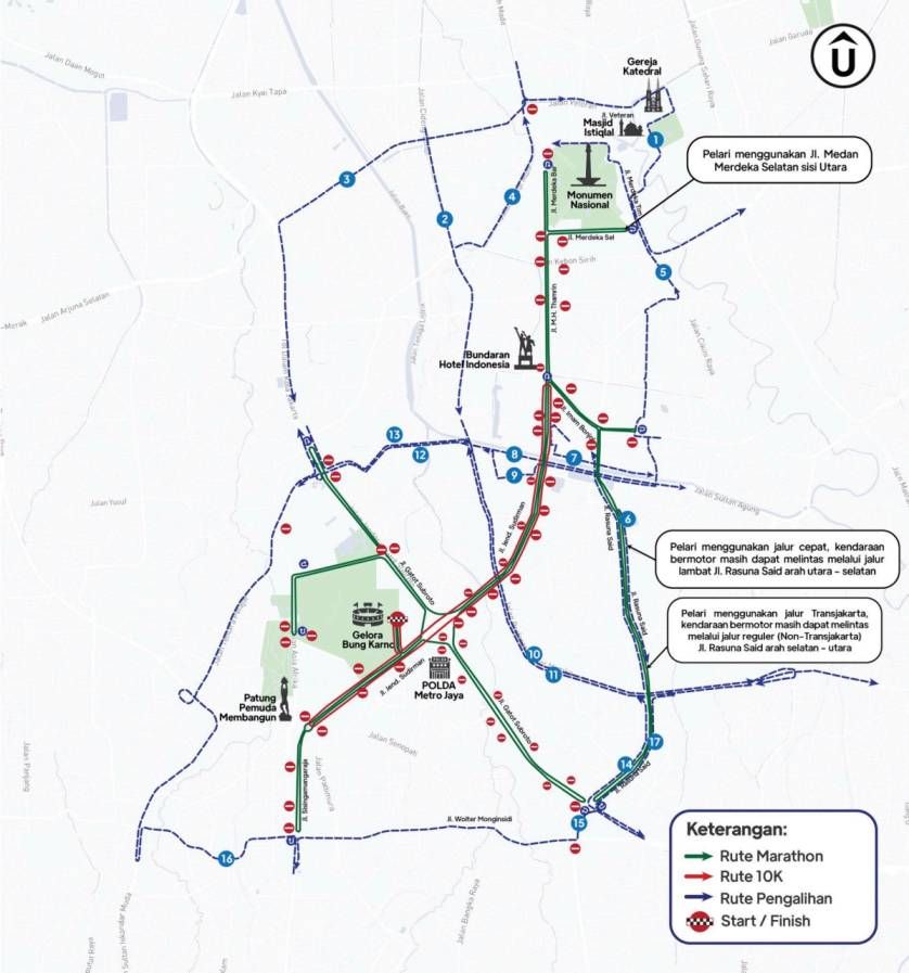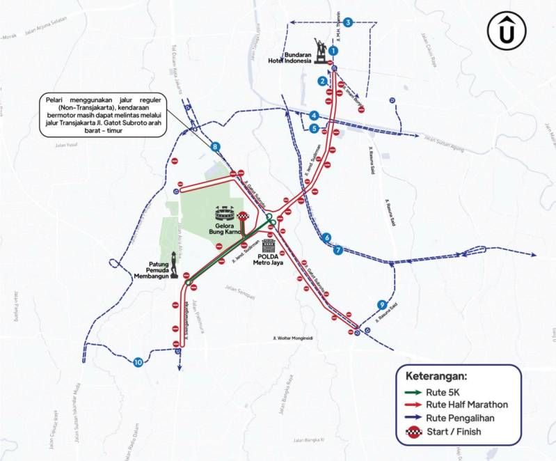 Berikut adalah rincian ruas jalan yang akan ditutup sementara dan rute alternatif selama pelaksanaan wondr Jakarta Running Festival 2025: