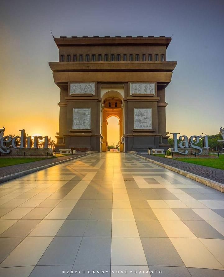 Monumen setinggi 25 meter dan berluas dasar 804 meter persegi ini, yang ukurannya secara filosofis merefleksikan tanggal hari jadi Kabupaten Kediri (25 Maret 804 Masehi), menampilkan gaya arsitektur neo-klasik Eropa yang menyerupai Arc de Triomphe di Paris, namun diperkaya dengan kearifan lokal melalui relief-relief artistik pada setiap sisi dindingnya yang secara detail mengisahkan sejarah panjang Kerajaan Kediri, kisah Panji, dan keberagaman budaya setempat.