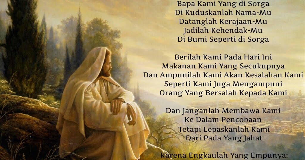 “Maka Yesus berkata kepada mereka, ‘Bila kalian berdoa, katakanlah: ‘Bapa, dikuduskanlah nama-Mu; datanglah Kerajaan-Mu. Berilah kami setiap hari makanan yang secukupnya, dan ampunilah dosa kami, sebab kami pun mengampuni yang bersalah kepada kami; dan janganlah membawa kami ke dalam pencobaan.’”