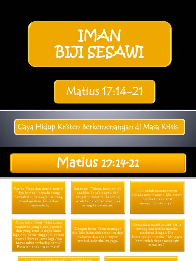 Biji sesawi adalah benih kecil yang tumbuh menjadi pohon besar. Begitulah iman kita: mungkin kecil di awal, tapi akan tumbuh bila dipupuk dengan ketaatan dan kasih. Iman bukan soal seberapa banyak kita tahu tentang Allah, melainkan seberapa dalam kita mempercayakan hidup kita kepada-Nya bahkan saat tidak mengerti jalan-Nya.