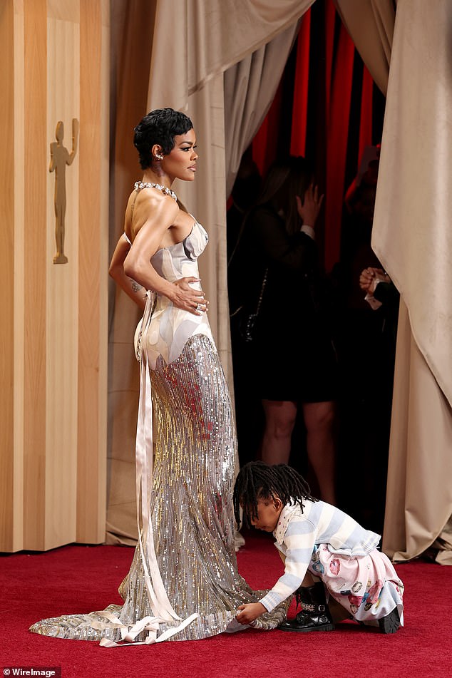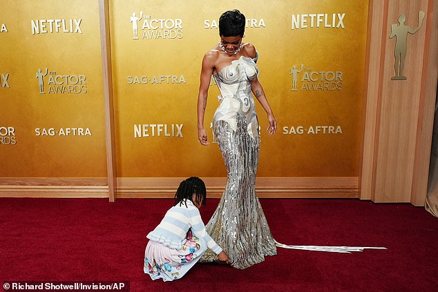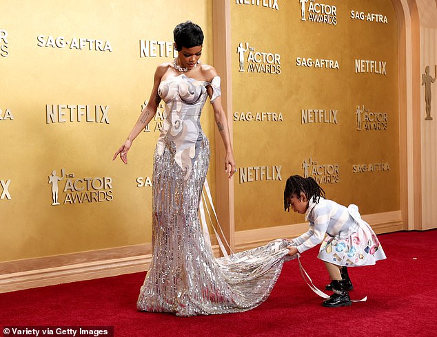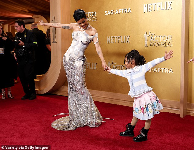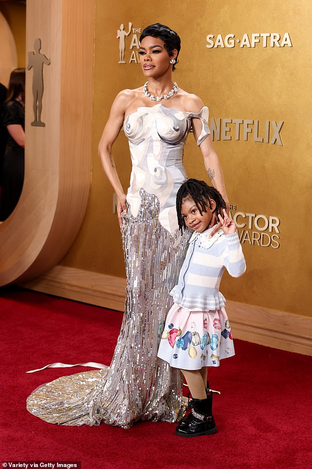 Teyana Taylor may have brought the glamour, but it was her pint-sized daughter who stole the show at the 2026 Actor Awards. The 35-year-old actress, nominated for her performance as Perfidia Beverly Hills in Paul Thomas Anderson’s One Battle After Another, turned heads in a bold, eye-catching ensemble at Los Angeles’s Shrine Auditorium. Taylor dazzled in a silver-and-grey trompe l’oeil gown complete with fabric nipples and a cascading train, paired with a glittering diamond necklace that caught every flash of the cameras. She accessorized with cluster diamond earrings and a Tiffany & Co. necklace that wrapped elegantly around her neck, completing a look that was pure red-carpet perfection.