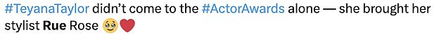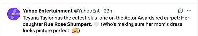 Fans quickly took to social media to gush over the fledgling little star. One wrote, “Teyana Taylor has the cutest plus-one on the Actor Awards red carpet: her daughter Rue Rose Shumpert (who’s making sure her mom’s dress looks picture perfect!).” Another added, “Teyana’s daughter doing her princess duties,” while a third chimed in, “#TeyanaTaylor didn’t come to the #ActorAwards alone – she brought her stylist Rue Rose.”