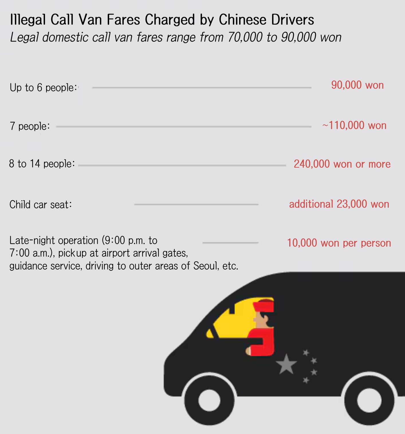 Berbeda dengan rekan-rekan legal mereka yang membebankan tarif tetap yang telah disetujui kementerian (misalnya, 74.000 won ke Hongdae, 80.000 won ke Myeongdong atau Namsan), pengemudi ilegal dan agen perjalanan terkait sering membebankan tarif hingga tiga kali lipat. Beberapa platform perjalanan Tiongkok mempromosikan layanan antar-jemput bandara dengan harga 200.000 hingga 300.000 won—sering kali tanpa penumpang menyadari bahwa mereka menggunakan jasa layanan yang tidak berizin.