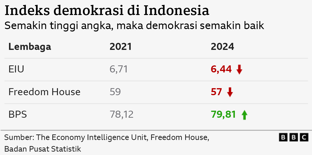 Di sisi lain, pemerintah melalui Menteri Hak Asasi Manusia (HAM), Natalius Pigai, mengatakan demokrasi Indonesia mengalami “surplus”. “Tidak ada satu keputusan pemerintah atau peraturan yang membatasi demokrasi di Indonesia,” kata Pigai. Namun, sejumlah lembaga riset internasional melaporkan indeks demokrasi di Indonesia mengalami penurunan secara halus dalam beberapa tahun terakhir, meskipun Badan Pusat Statistik (BPS) menunjukkan sebaliknya.