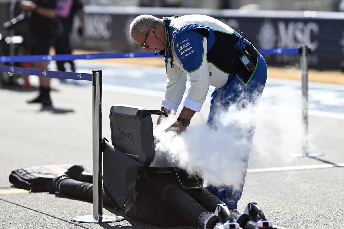 Anggota tim Racing Bulls di grid dengan peralatan pendingin