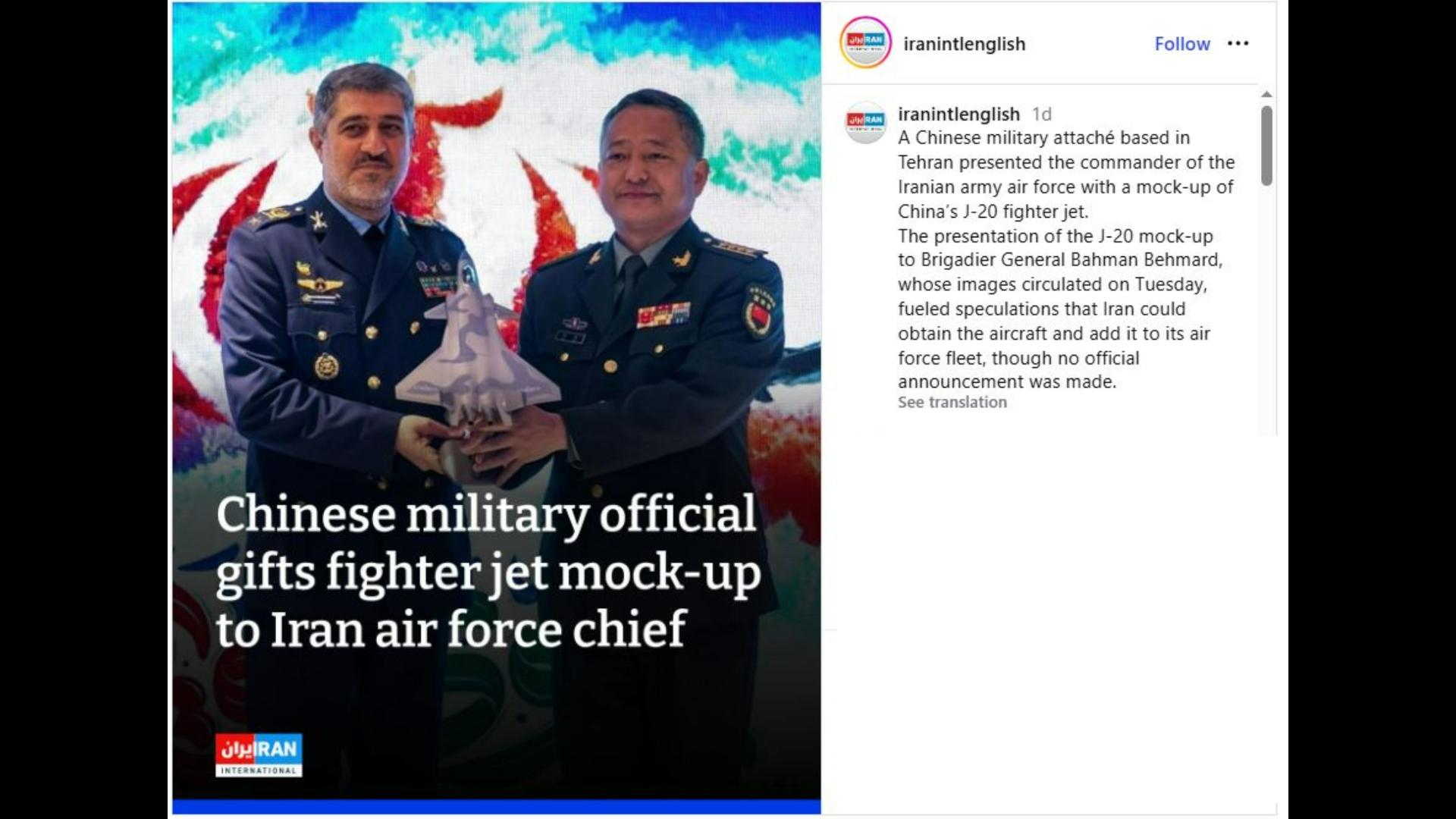 Pada 10 Februari 2026, dalam pertemuan militer di Kota Teheran, Iran, para pejabat militer China memberikan miniatur atau replika skala pesawat tempur siluman Chengdu J-20 “Mighty Dragon” kepada rekan mereka dari Iran. Acara ini digelar dalam rangka perayaan Hari Angkatan Udara dan dihadiri oleh atase militer asing yang berbasis di Teheran serta Brigadir Jenderal Bahman Behmard, Komandan Angkatan Udara Republik Islam Iran (IRIAF). Meskipun laporan media lokal tidak menyebutkan banyak detail, foto-foto resmi menunjukkan para pejabat memegang model skala pesawat tempur J-20 generasi kelima.