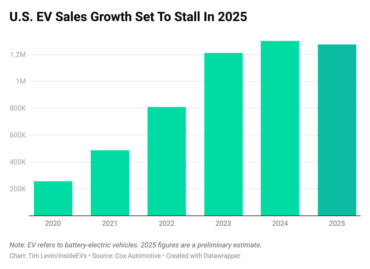 After years of incredible growth, U.S. EV sales are on track to fall slightly this year, the firm says. Preliminary data indicate that 230,000 electric cars will be sold in Q4 of 2025, a 46% drop from Q3 and a 37% decline year-over-year. The electric share of the car market dropped to 5.7% in the quarter.